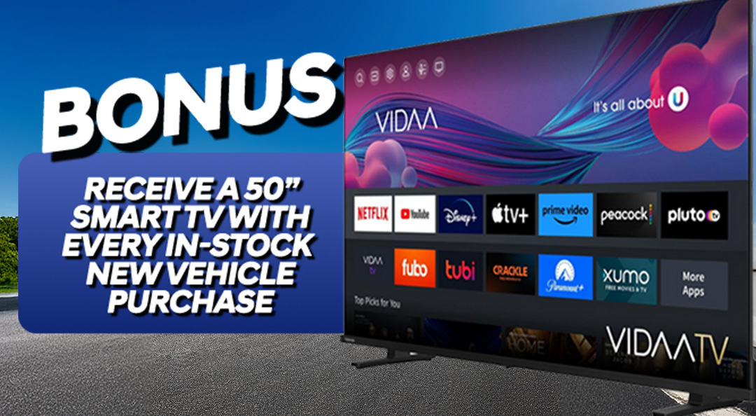 *Offer valid with the purchase of any in-stock new vehicle while supplies last. Complimentary 50" Smart TV is non-transferable, has no cash value, and must be accepted as awarded. Offer cannot be combined with other promotions, discounts, or incentives. Limit one TV per vehicle purchase. Dealer is not responsible for delays or availability of promotional item. Promotion subject to change or cancellation without notice. Additional conditions may apply. See dealer for full details.